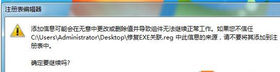 3、双击打开你保存好的“修复EXE关联.reg”文件,点“是”来将代码导入注册表中。