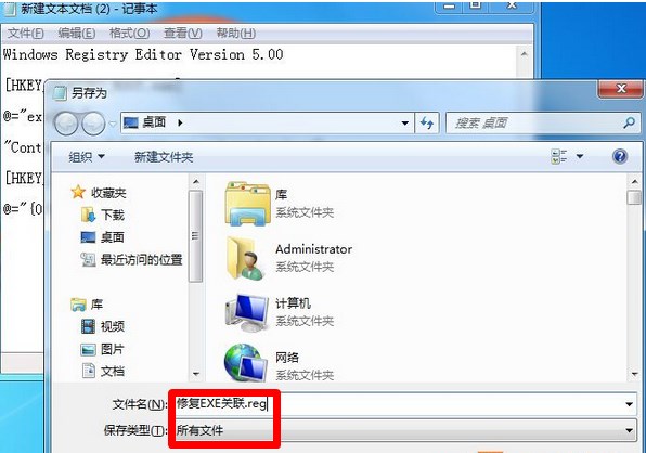 2、然后点击记事本上的文件,另存为,将文件格式设置为“所有文件”,并将该文件命名为 修复EXE关联.reg,保存在你可以找到的地方,如桌面;