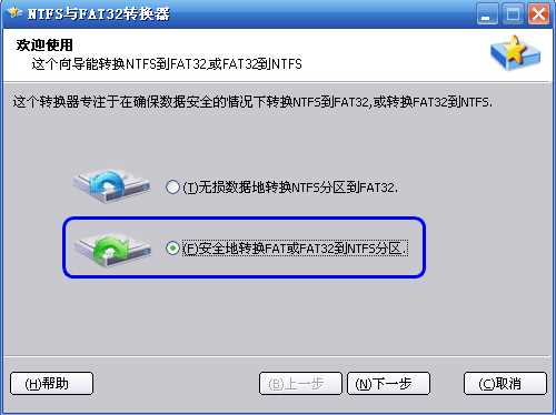 2、然后进入如下图3所有示的界面中,让您选择是转换NTFS到FAT32呢,还是转换FAT或FAT32到NTFS分区,这里选择“安全地转换FAT或FAT32到NTFS分区”选项,如下: