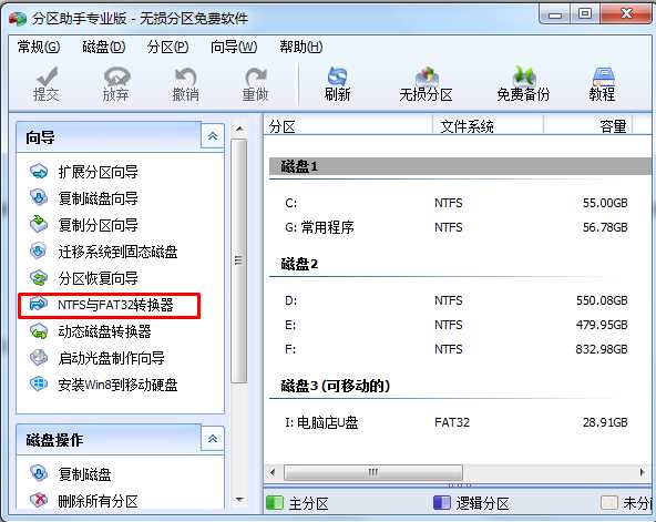 1、分区助手专业版”,下载完成后安装并运行它。然后点击左侧的【NTFS与FAT32转换器】