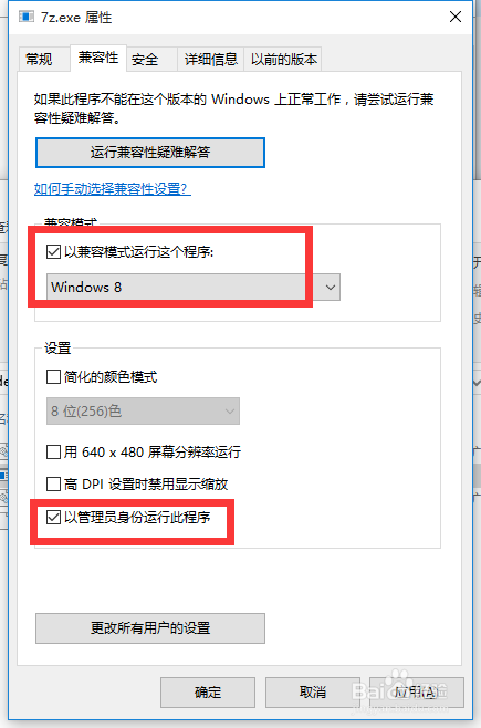 6:从打开的“7z.exe属性”窗口中,切换到“兼容性”选项卡,勾选“以兼容模式运行这个程序”,并选择“windows 8”项,同时勾选“以管理员身份运行”项,点击“确定”完成设置。