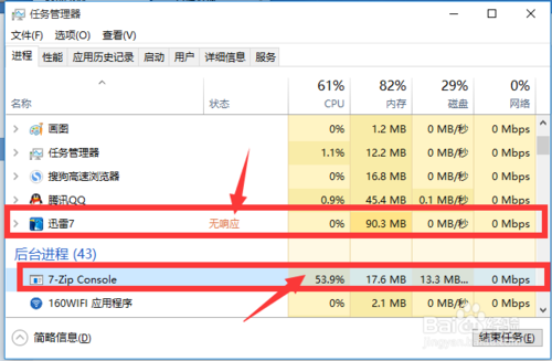 2:从打开的“任务管理器”界面中,切换到“进程”选项卡,从中可以发现“迅雷7”处于“无响应”状态,同时“7-zip Console”进程占用CPU很高。