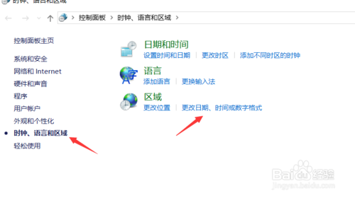 4:进入后找到时钟、语言和区域-更改日期-时间和数字格式,之后点击进入弹窗