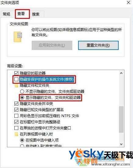 2、点击“查看”选卡,在下面将“隐藏受保护的操作系统文件(推荐)”前面的勾去掉,确保下面以选择“显示隐藏的文件、文件夹和驱动器”,点击应用并确定,就可以看到了。