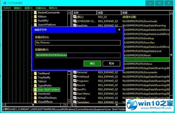 3.双击右边的“My pictures”,在“数值数据”中输入“%UsERpRoFiLE%\pictures”,把保存路径还原;