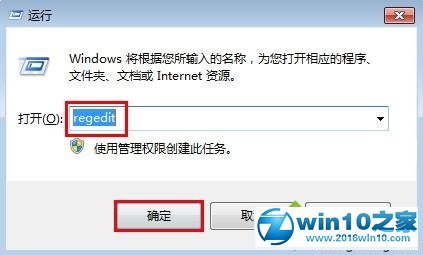 2.打开运行窗口后,输入“regedit”运行命令,点击“确认”进入下一步。如下图所示: