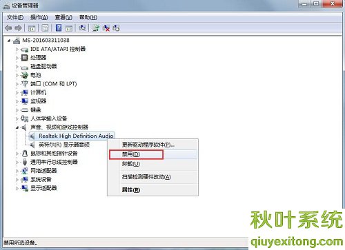 4、点右键选择”禁止“——然后再点右键选择”启动“重新启动一次,即可有声音了。