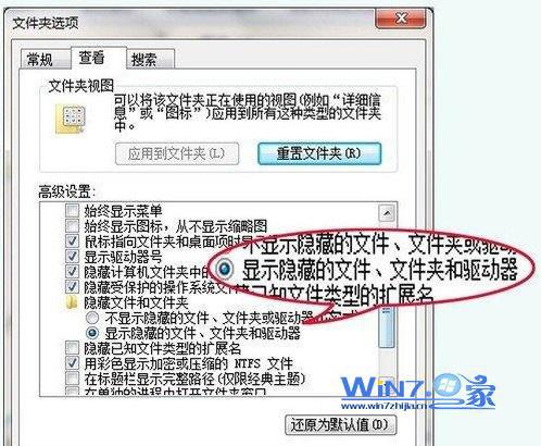 2、在文件夹选项窗口中,切换到“查看”选项卡,设置“显示隐藏文件、文件夹和驱动器”;