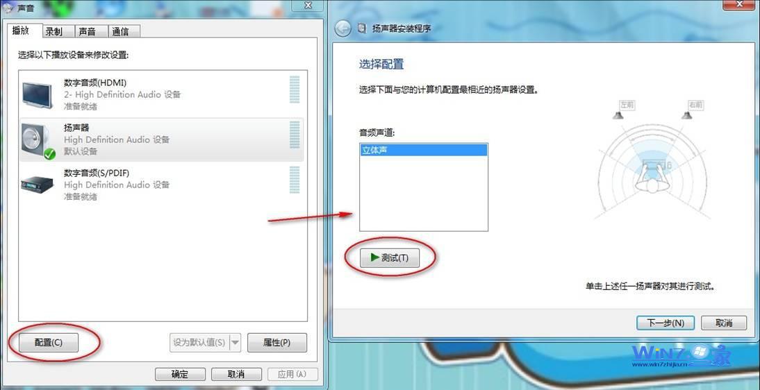 5、然后可以在声音的窗口中点击一下配置按钮测试一下即可。