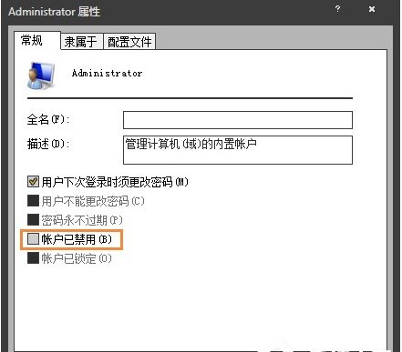3、在Administrator属性界面中,取消勾选“帐户已禁用”,点击确定即可;