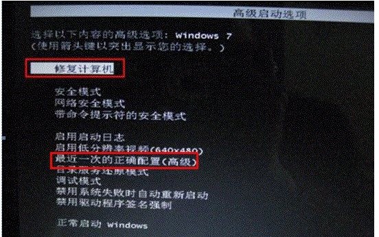 1、首先重启win7系统,然后一下一下按F8键,进入“系统高级选项菜单”后,我们选择“最后一次正确配置”。
