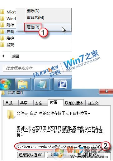 按“开始”按钮,在程序菜单中找到“启动”,右键鼠标选择“属性”;在“位置”选项卡上我们可以看到完整的路径。