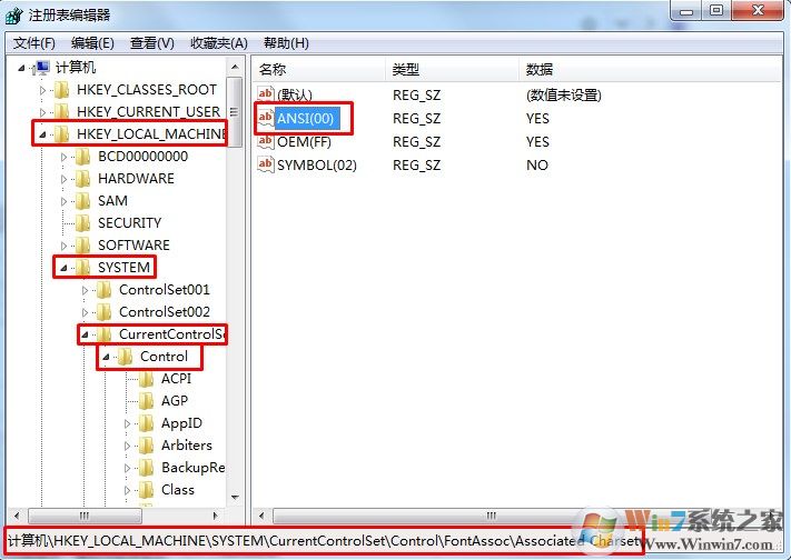 二、在注册表中,依次展开“HKEY_LOCAL_MACHINE \ System \ CurrentControlSet \ Control \ FontAssoc”项,然后在该项下找到Aossiated CharSet项,在右侧窗格右键单击空白位置处,选择“新建”-“字符串值”,输入键值名为ANSI(00),然后双击打开进入编辑窗口,在编辑窗口中输入Yes。