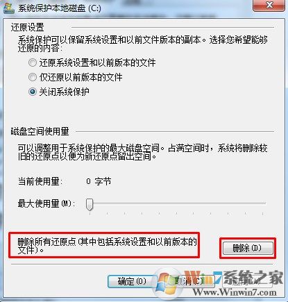 3、保护功能关闭后,我们还要将原来创建的还原点全部删除,如下图: