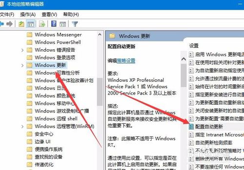 4:然后在展开的windows组件菜单中找到“windows更新”菜单项,接着在右侧打开的新窗口中找到“配置自动更新”的设置项。
