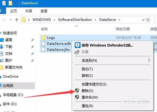 8:打开softwaredistribution文件夹后,双击打开datastore文件夹,把该文件夹下面的所有的文件全部删除。