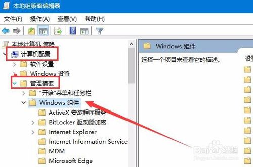 3:在打开的本地组策略编辑器窗口中,点击左侧边栏的“计算机配置/管理模板/windows组件”菜单项。