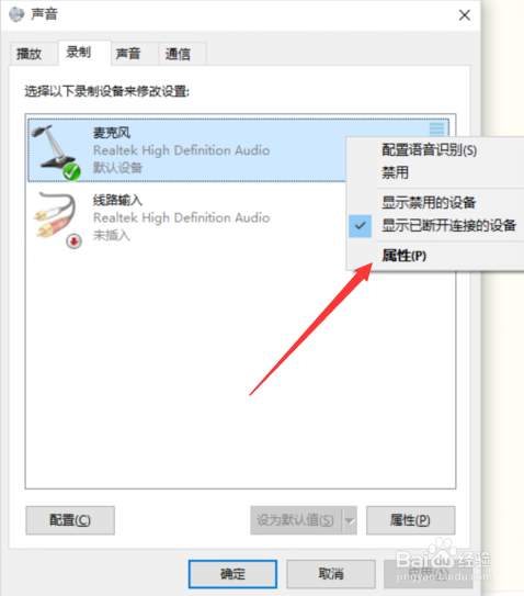 3:在这里可以看到我们的麦克风设备是否在工作,右键默认麦克风,选择属性