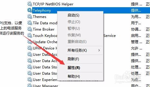 4:在右侧的窗口中找到Telephony服务项,然后右键点击该服务项,在弹出菜单中点击属性菜单项。