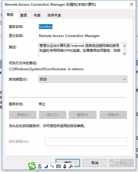 7:用同样的方法,我们再找到Remote Access Connection Manager服务项,在其属性窗口中把其启动同时设置启动类型为自动,然后再次拨号就可以正常上网了,不会再出现711错误。