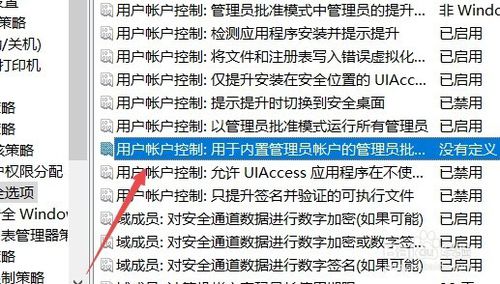 5:在右侧窗口中找到用户帐户控制:用于内置管理员账户的管理员批准设置项。