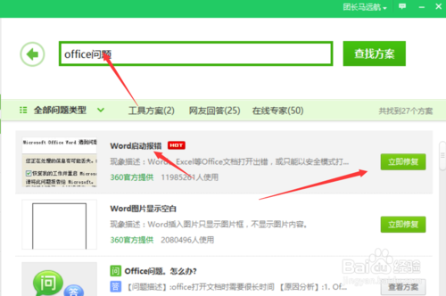 3:出现搜索结果之后,在下角找到word问题,点击这个出现弹窗,之后点击右下角的修复。
