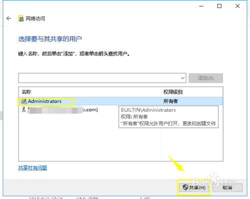 5:我们选择administrator级别,点击共享按钮,如下图所示