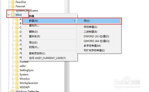7:如果你找不到该子项的话,那么证明系统注册表中是没有该子项文件的,因此我们可以手动创建该子项,在windows目录下点击右键,选择“新建-项”,并将该项的名称命名为“windowsUpdate”,在新建立的windowsUpdate项目下,按照同样的办法建立AU子项。