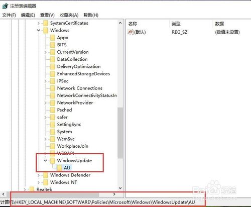 6:打开注册表编辑器页面之后,使用鼠标依次双击左侧的侧边栏,将文件定位到:HKEY_LoCAL_MACHinE\soFTwARE\Policies\Microsoft\windows\windowsUpdate\AU子项。