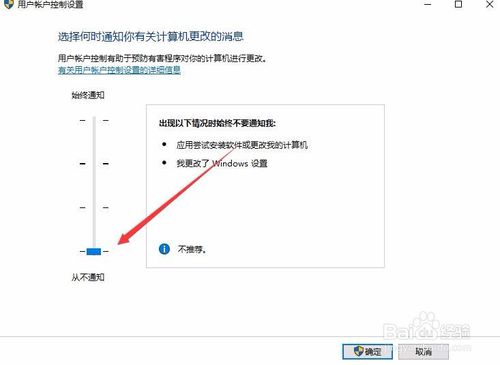 7:把上面的滑块拖动到最底端,最后点击确定按钮,这样再保存bitlocker密钥的时候就不会无法保存了。