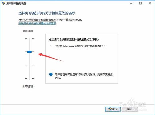 6:这时会打开“用户帐户控制设置”窗口,可以看到滑块处于中间的位置