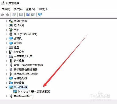 3:在打开的设备管理器窗口中,点击“显示适配器”折叠菜单,在这里可以看到显卡的驱动程序