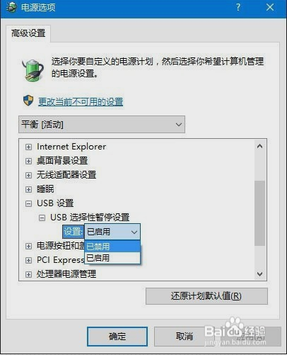 5:展开UsB设置—UsB选择性暂停设置,将其设置为“已禁用”,确定。