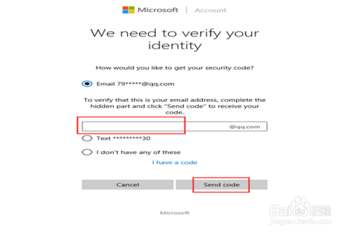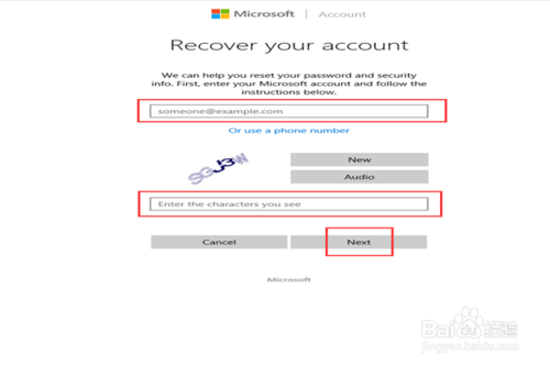 5:然后在下一个英文界面中,看下图所示,从第一个红色框框起来的地方输入你Microsoft的邮箱,在第二个红色框框起来的地方输入上面的验证码,然后点next