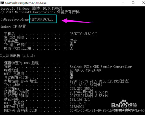 2:在dos界面里输入iPConFiG/ALL来检验电脑网卡。