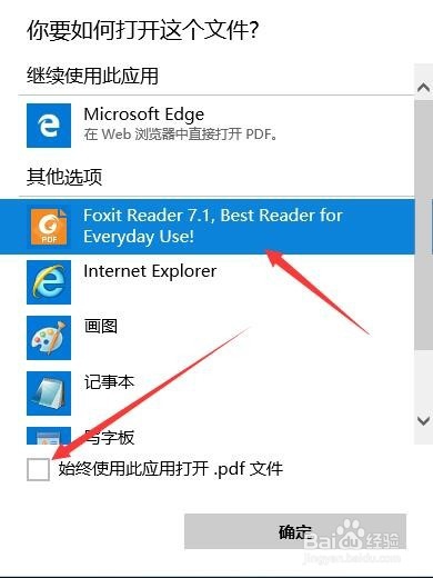 6:接下来会弹出“你要如何打开这个文件”的窗口,在这里选择我们习惯使用的PdF阅读器应用,然后选中下面的“始终使用此应用打开.pdf文件”前的复选框,最后点击确定按钮即可。