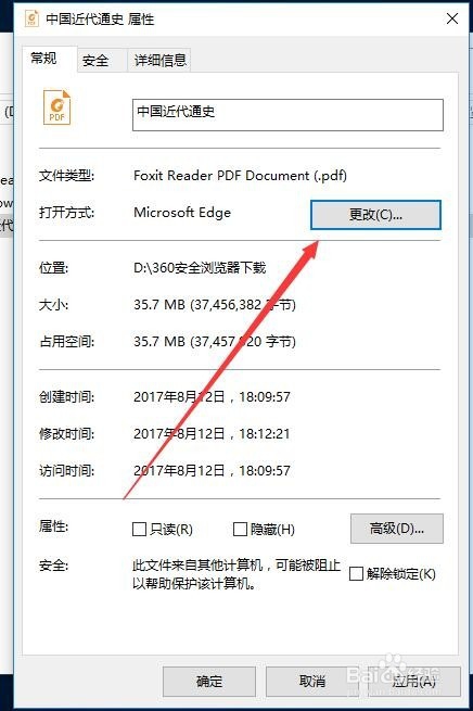 2:这时会打开该文档的属性窗口,在窗口中点击“更改”按钮