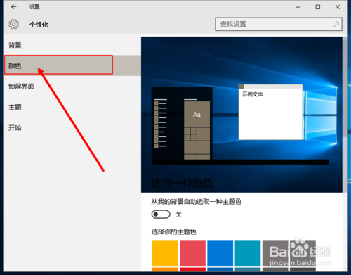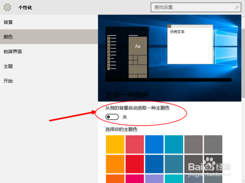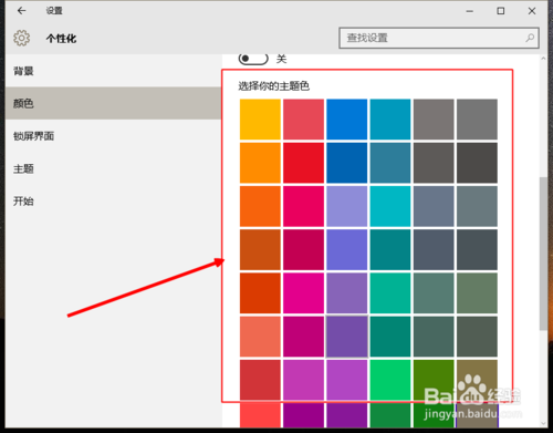 5:选择好自己喜欢的壁纸后,我们点击右侧的“颜色”,我们可以直接点击“开”选择在背景壁纸中选择一种颜色做为主题色(如下图)