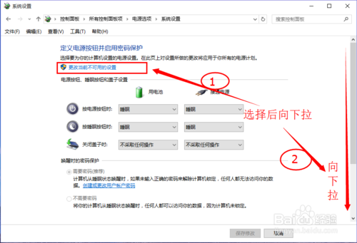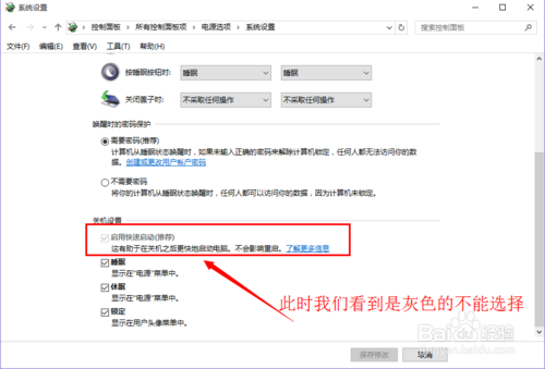 4:如图所示,选择【更改当前不可更改的设置】,往下拉动,找到【启用快速启动】,此时我们看到是灰色的不能选择,接着看下一步。