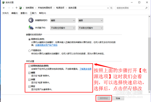 12:按照上面的步骤打开电源设置,如图所示,这时可以看到【启用快速启动】可以选择了,选择后点击保存修改。