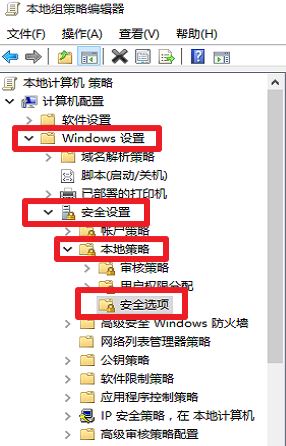 7、在打开本地组策略编辑器左侧依次展开: 计算机配置 --- windows 设置 --- 安全设置 ---本地策略 ---安全选项 ;
