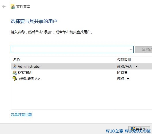 15、打开共享窗口后,选择要共享的用户,这里如果有名称为Everyone的用户,则选择Everyone用户,然后点击右下角“共享”按钮,如果没有则选择当前用户账户,点击“共享”按钮;