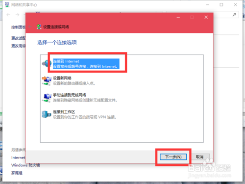 3:【设置连接或网络】的窗口,选择”连接到internet“这一项,然后点击”下一步“。