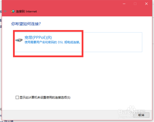 5:【连接到internet】的窗口,点击”宽带(PPPoE)(R)。