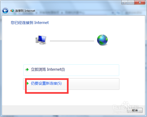 4:【连接到internet】的窗口,选择”设置新连接“。