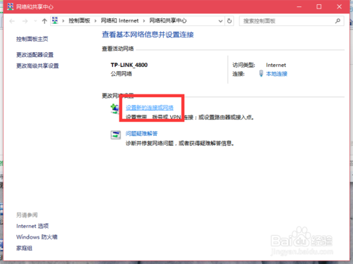 2:【网络和共享中心】的窗口,选择”更改网络设置“,点击”设置新的连接或网络“。