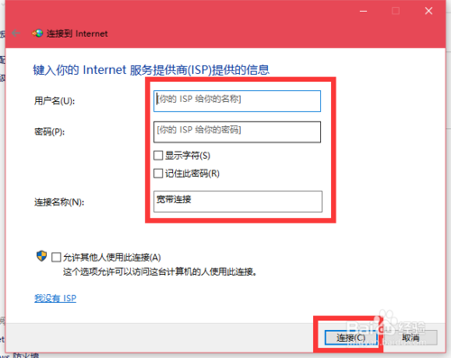 6:【连接到internet】的窗口,输入你的“用户名”和”密码“和”连接名称“,最后点击”连接“即可。