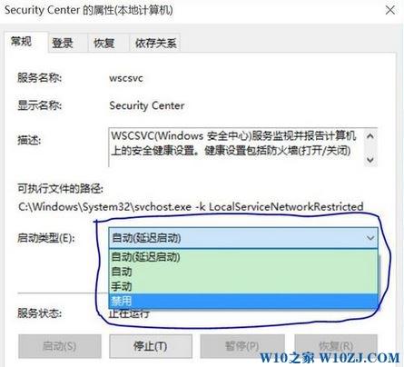 3、在弹出的属性界面,点击【停止】停止该服务,然后将启动类型设置为“禁用”即可;