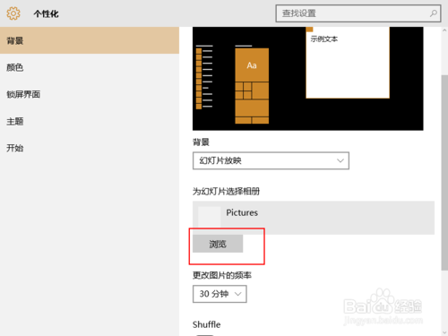 7:这次在背景选项卡中,我们就可以选择我们想要的图片相册作为背景切换的源相册了。点击浏览。