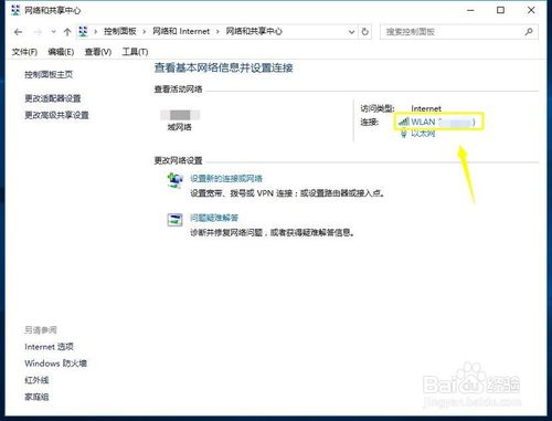 5:在网络共享中心点击目前连接的网路名称,如下图所示